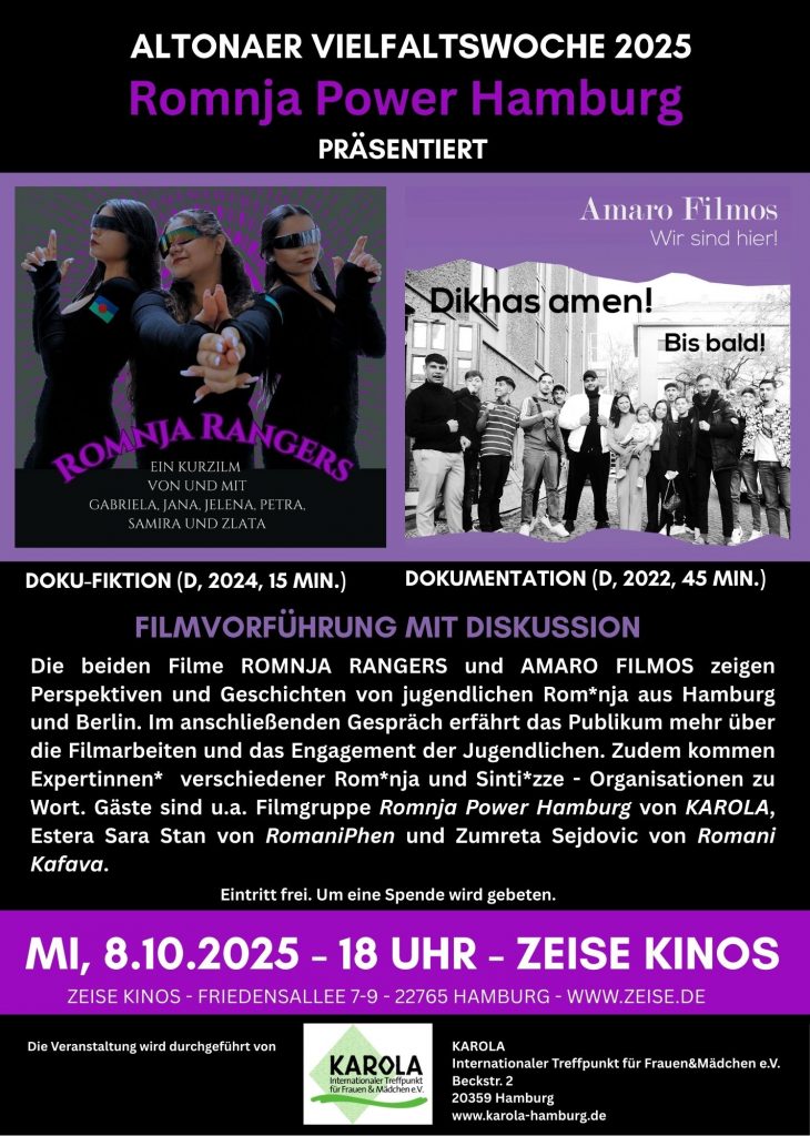 Im Rahmen der Altonaer Vielfaltswoche präsentiert unsere Filmgruppe Romnja Power Hamburg ihren preisgekrönten Kurzfilm „Romnja Rangers“ (D, 2024, 15 Min.). In der Doku-Fiktion verarbeiten die jungen Filmemacherinnen* ihre Diskriminierungserfahrungen und wählen Humor als ein Mittel, um sich aus der Ohnmacht angesichts von rassistischen Äußerungen zu befreien.