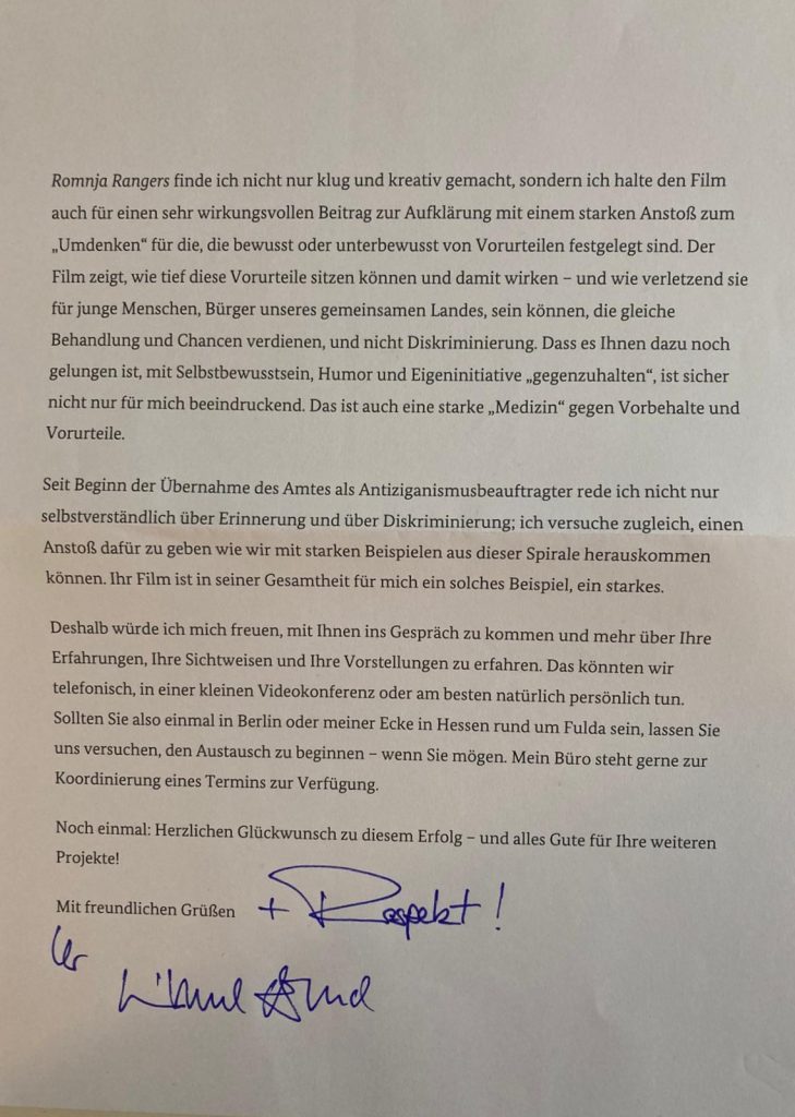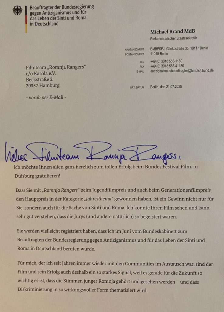 Der Kurzfilm ist im Rahmen des Projektes „Chancen statt grenzen für Rom*nja“ (2023 – 2025) entstanden. Auf Instagram geben die Jugendlichen, deren Gruppe sich romnja_power_hamburg nennt, Einblicke in die Entstehung und Präsentation des Filmes. Folge ihnen gerne hier auf Instagram.